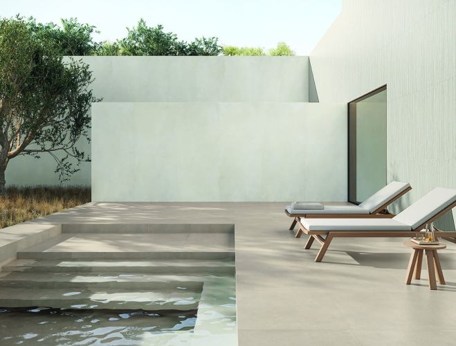 Italgraniti erweitert die Ausdrucksmöglichkeiten von Zement, die seine materiellen Werte auf neue Weise wiedergibt.
