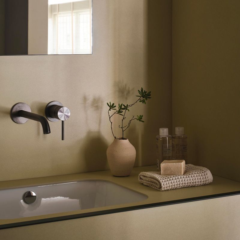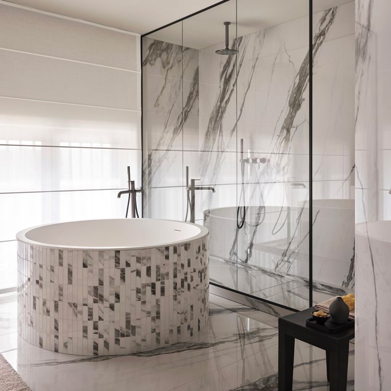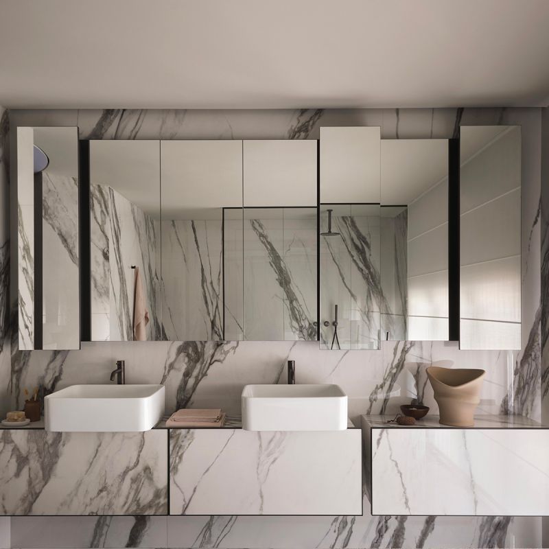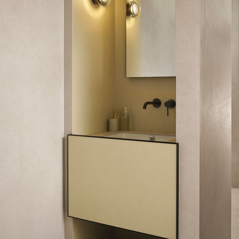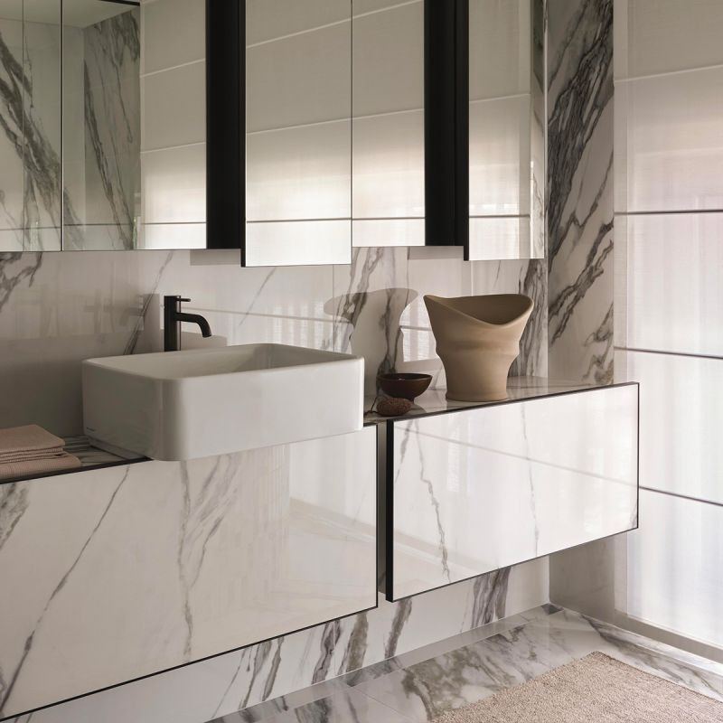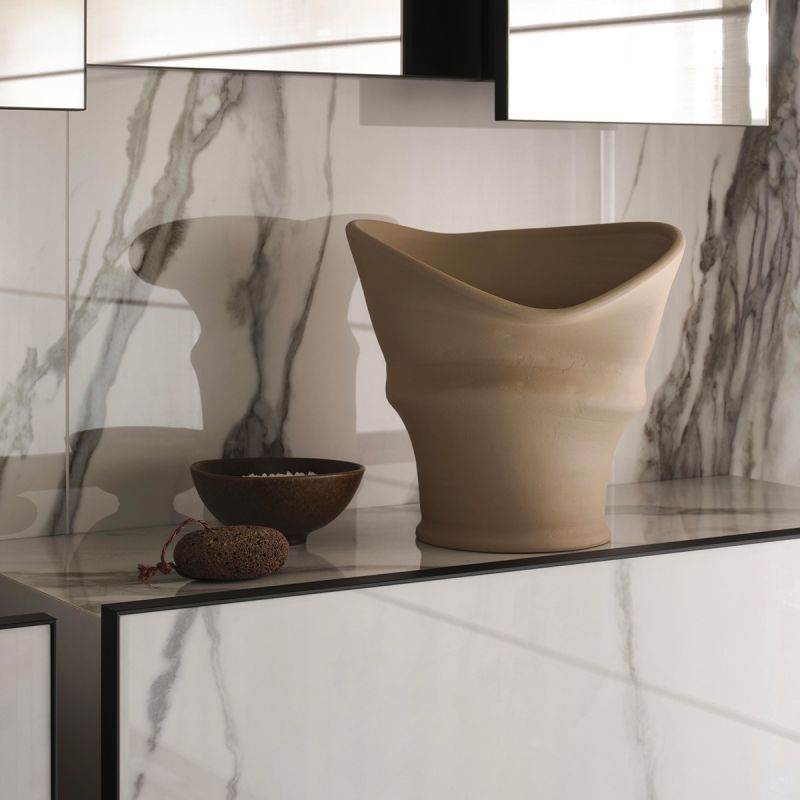 A distinctive feature of LOOM is the possibility of customizing the furnishings with 6 mm thick slabs and mosaics from all the Mega ® collections. The ceramic covering makes them design complements perfectly integrated with the environments that host them, both residential and public, for projects characterized by maximum coordination with the ceramic finishes of floors and walls.