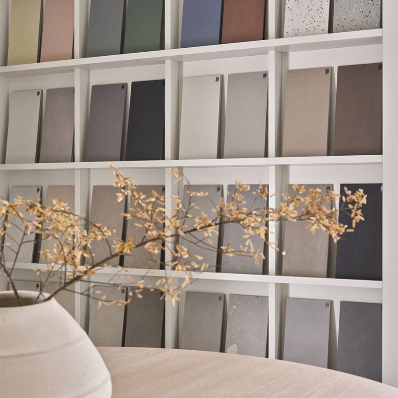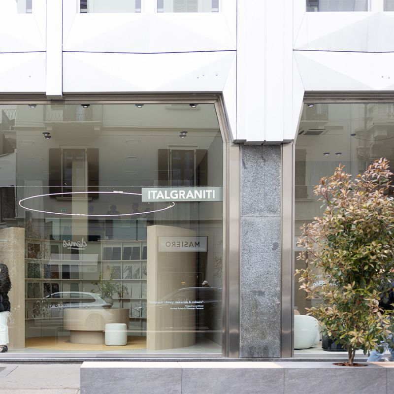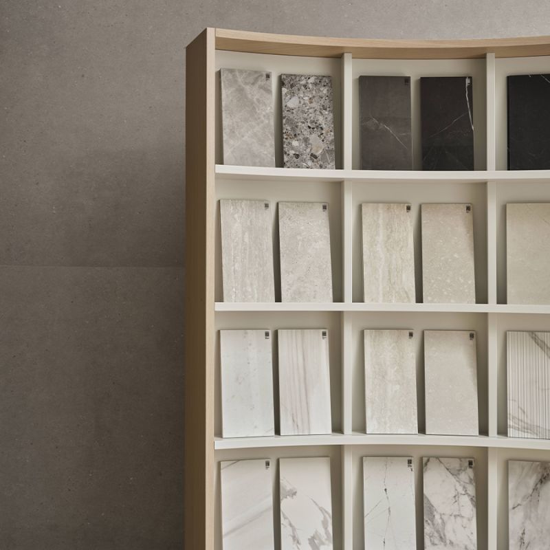 The new Italgraniti Library installation, designed by architects Andrea Parisio and Giuseppe Pezzano, celebrates the beauty and versatility of ceramics, taking inspiration from the elementary geometry of the circle. A space takes shape for discovering porcelain stoneware, paying homage to the great libraries of the past—monuments to human knowledge: a "temple of matter" that finds a sense of solemnity and harmony in its circular structure. Here, the search for products becomes a simple and intuitive experience, with open shelves forming an amphitheater of colors and surfaces.