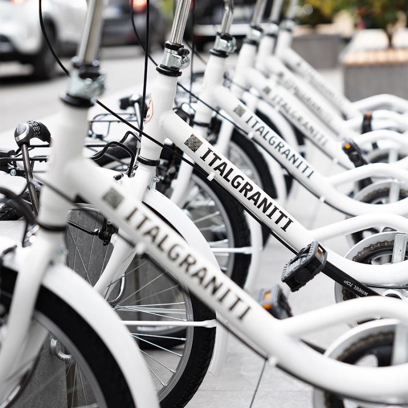 The outdoor installation outside the showroom windows, designed by art directors Andrea Parisio and Giuseppe Pezzano, introduces a new urban furniture system that combines sustainability, aesthetics, and functionality. This module consists of a bike rack, a seat, and a tree planter, which can be combined in various ways to meet the specific needs of each urban space: the bike rack to promote sustainable mobility, the seat to offer a resting space, and the green modules to improve environmental quality.
