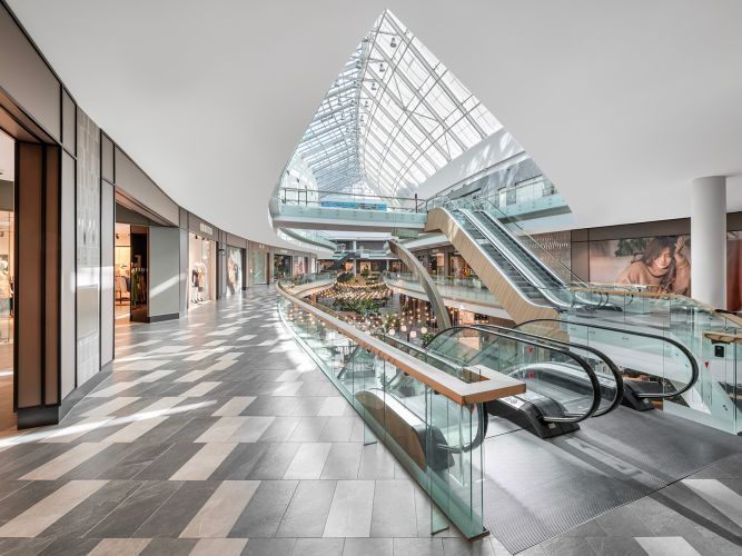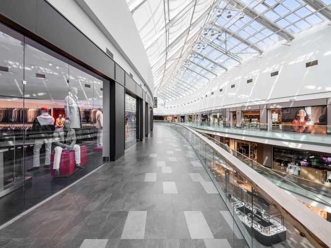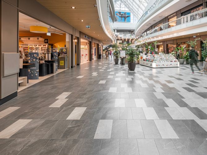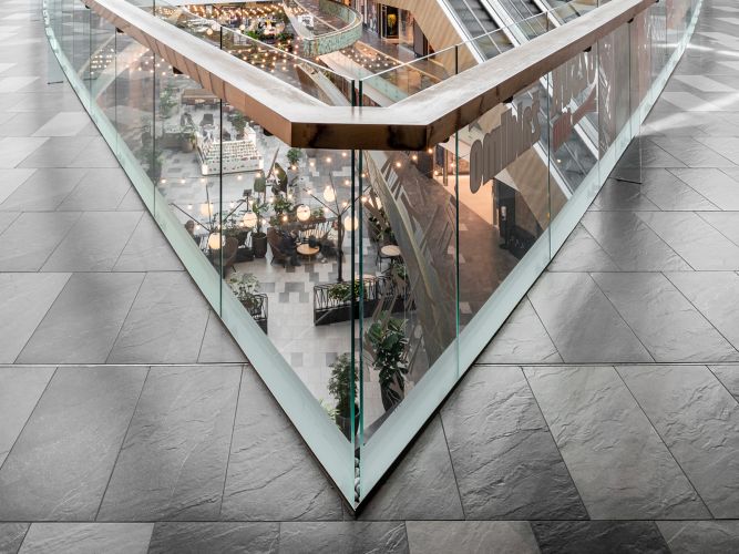 The use of Shale in the Europa Shopping Center gives the spaces a sophisticated yet welcoming materiality: the neutral-toned surfaces (such as greige) create an elegant atmosphere that aligns with contemporary design.