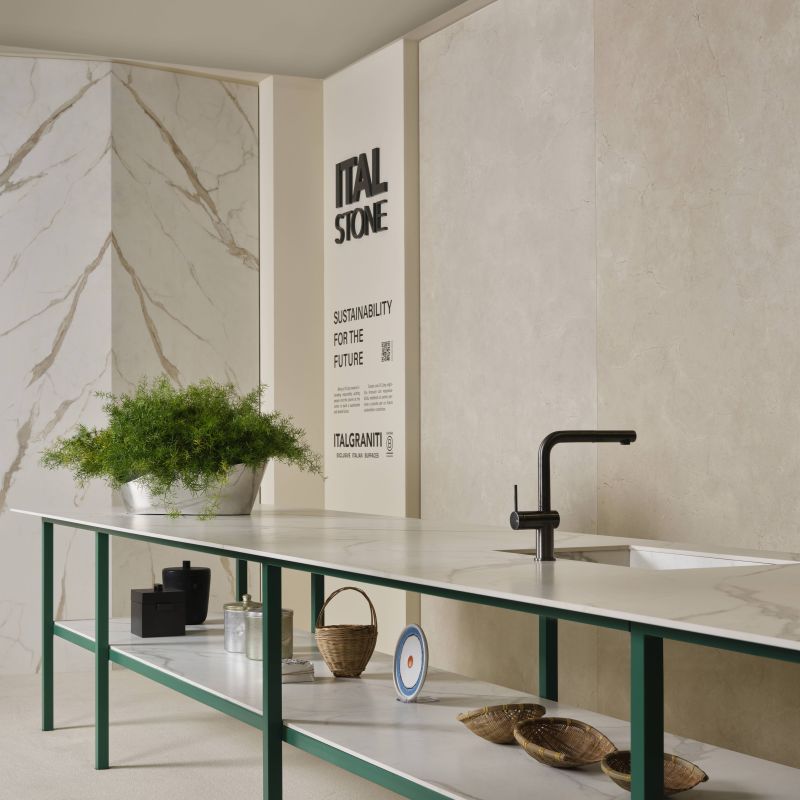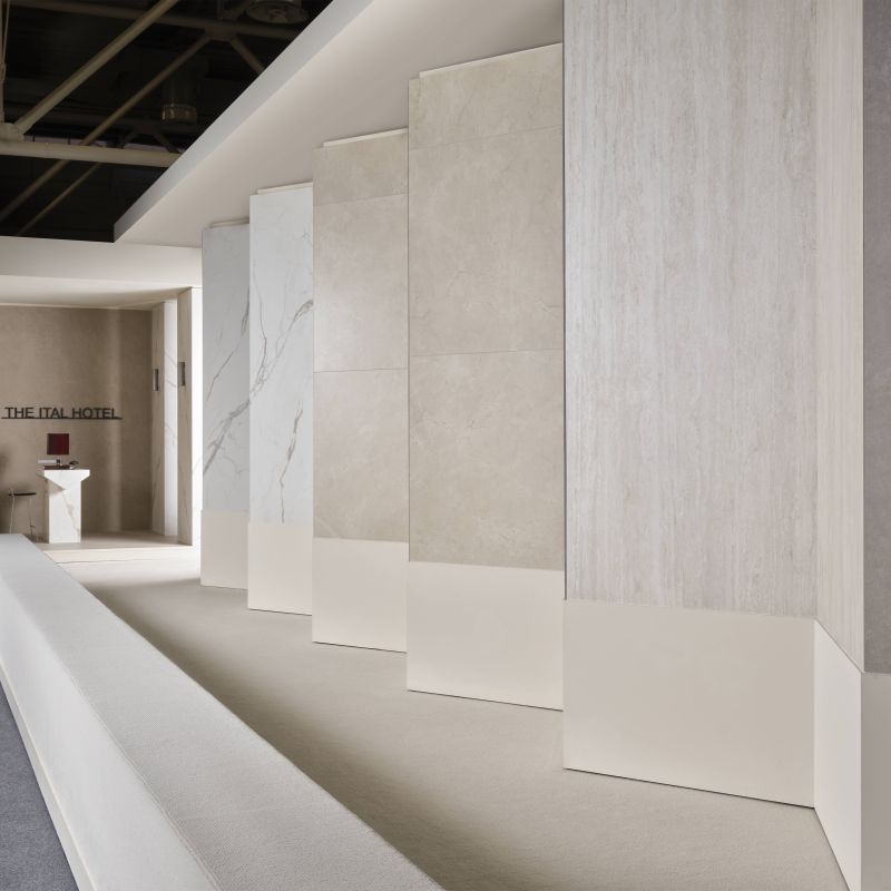 El stand de Italstone puso de relieve las infinitas posibilidades de diseño del formato losa, además de su capacidad para vestir cualquier contexto fusionando diseño y funcionalidad. La instalación fue también una ocasión única para apreciar en directo la innovadora tecnología RealUp®.