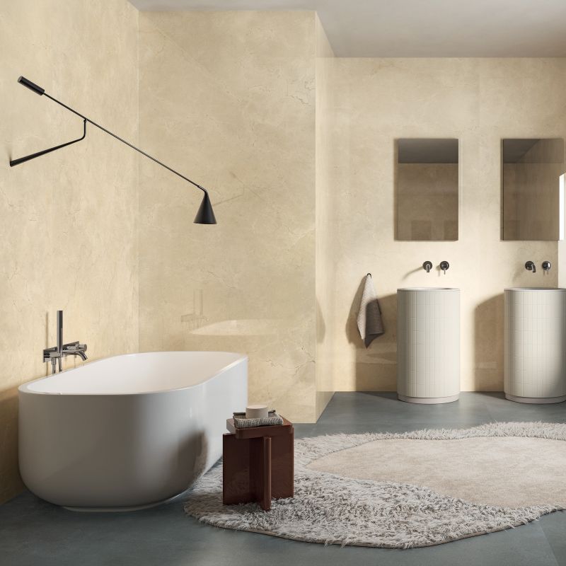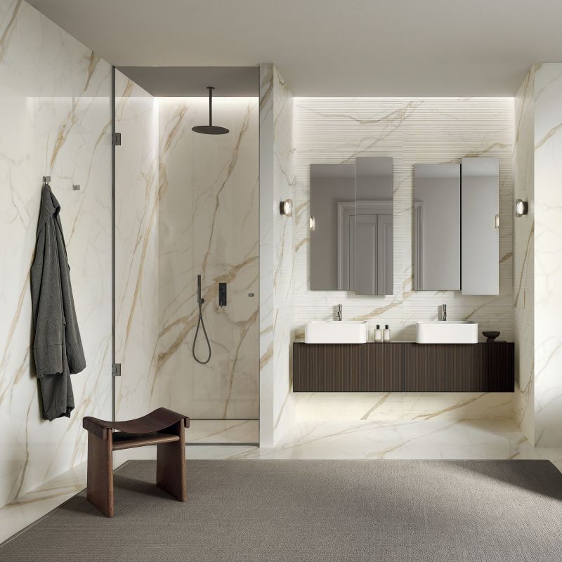 Если вы предпочитаете большие плитки, выбирайте вариант, представленный в тонких плитах. Благодаря форматам до 160×320 см можно включить в проект не только пол и стены, но и поддон душевой кабины или раковину. Как универсальная архитектурная поверхность, тонкий керамогранит подходит также для облицовки мебели, полок, столешниц, фасадов и дверей.